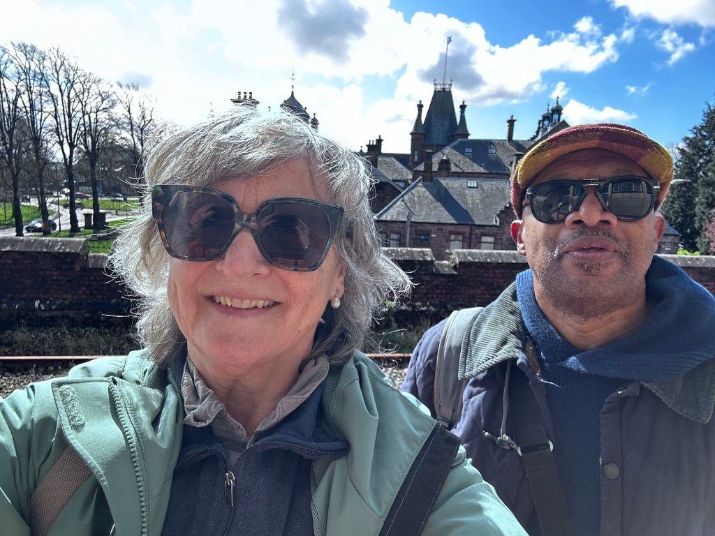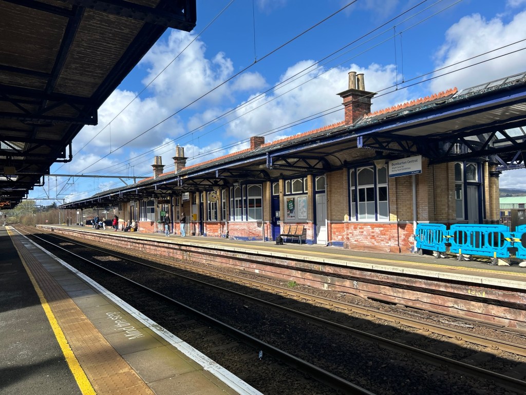 So Dunbarton Central station – you would think it might have a little cafe. Sadly not – but the sun shone while we waited 30 minutes for our train. As happens a lot, our reserved seats were filled by people who appeared perplexed that they were sitting (and had made camp) in our seats. Graciously they moved to the adjacent seats but so far they have talked non-stop so I have put in my headphones and am listening to some great tunes.