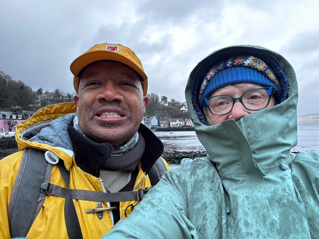 After breakfast we sailed to Tobermory via some cliffs where a pair of white-tailed eagles were usually visible along with many seals. I saw some deer. But that seemed to be it despite the good hour of glancing through the binoculars dodging the rain. We headed for Tobermory and moored up on the pontoon. With an hour to kill, Husbant and I put on all our clothes and wet weather gear to venture onto dry land and find some shops. It poured down but we loved every minute as you can see in the photo below…