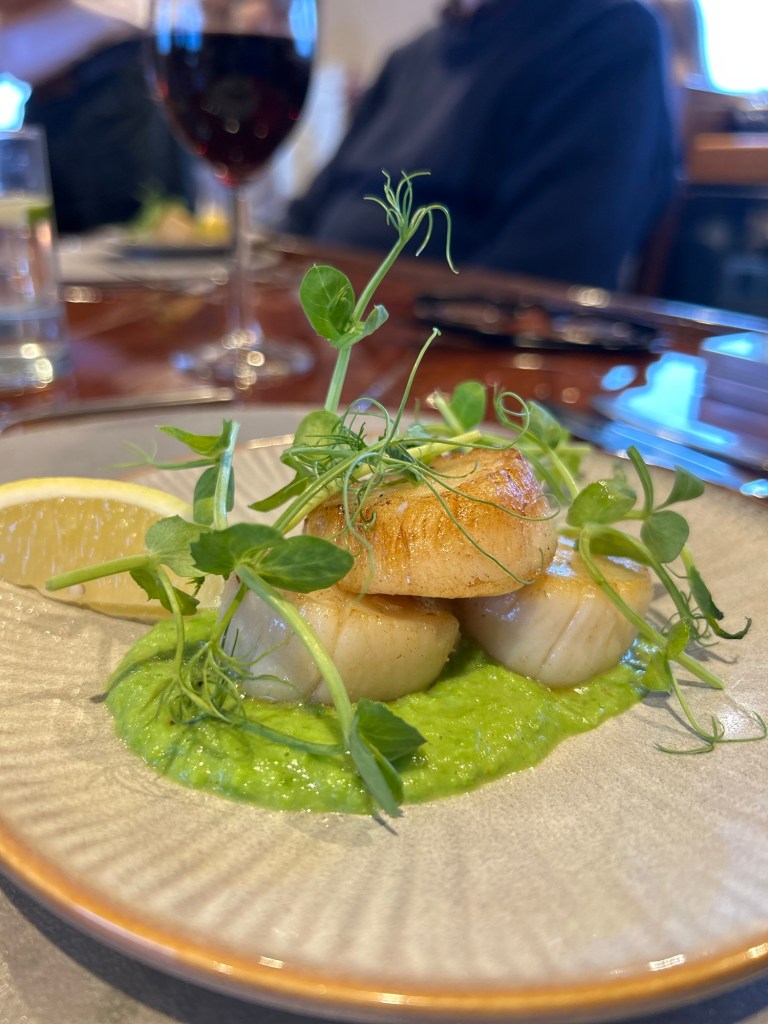 We have just had dinner – scallops with pea puree. The guy who owns Hebridean cruises is on the sister ship and is a scallop diver so he went down and got them this afternoon for us to eat tonight. I have never seen such big scallops and they tasted so fresh. I so wished AnnieB was with me to share in the delightfulness.