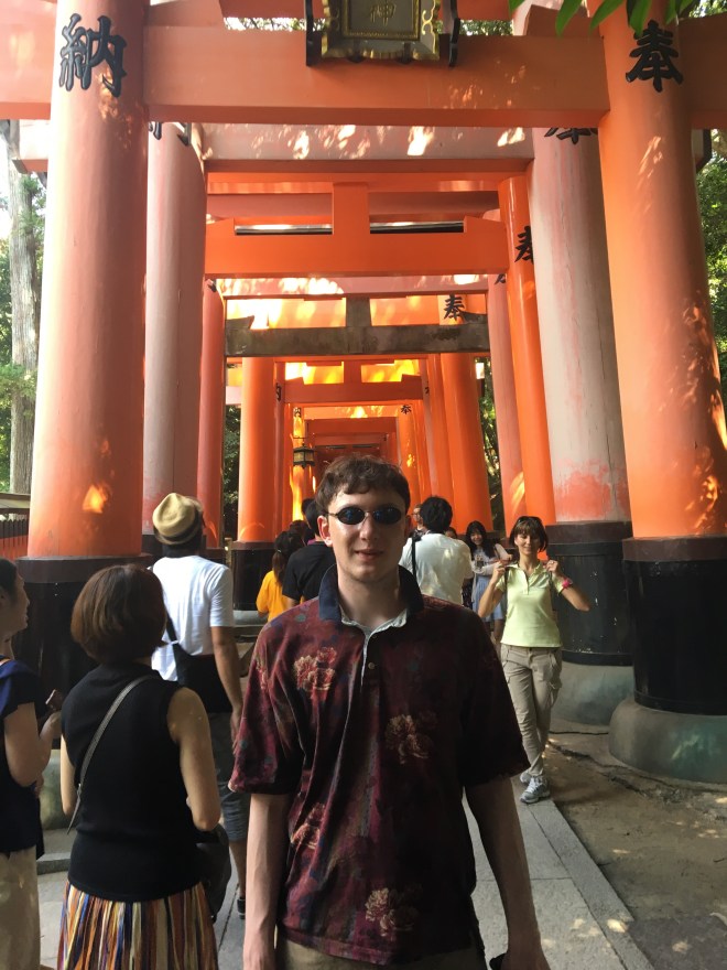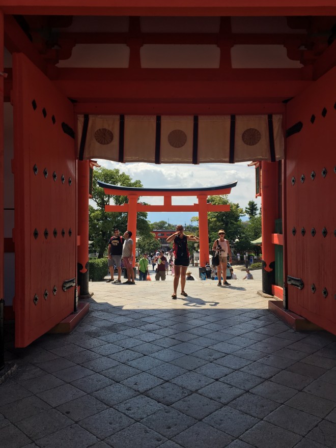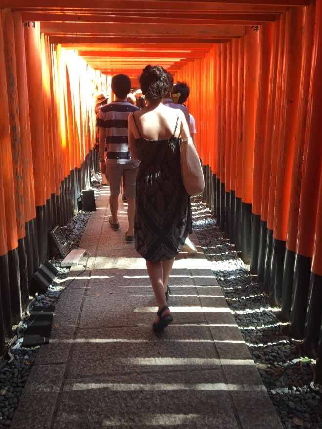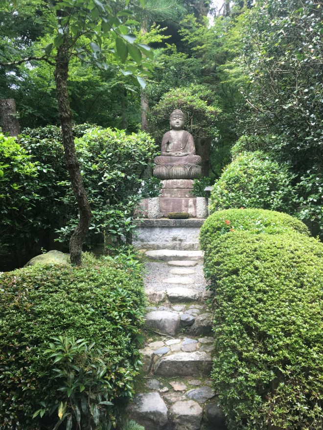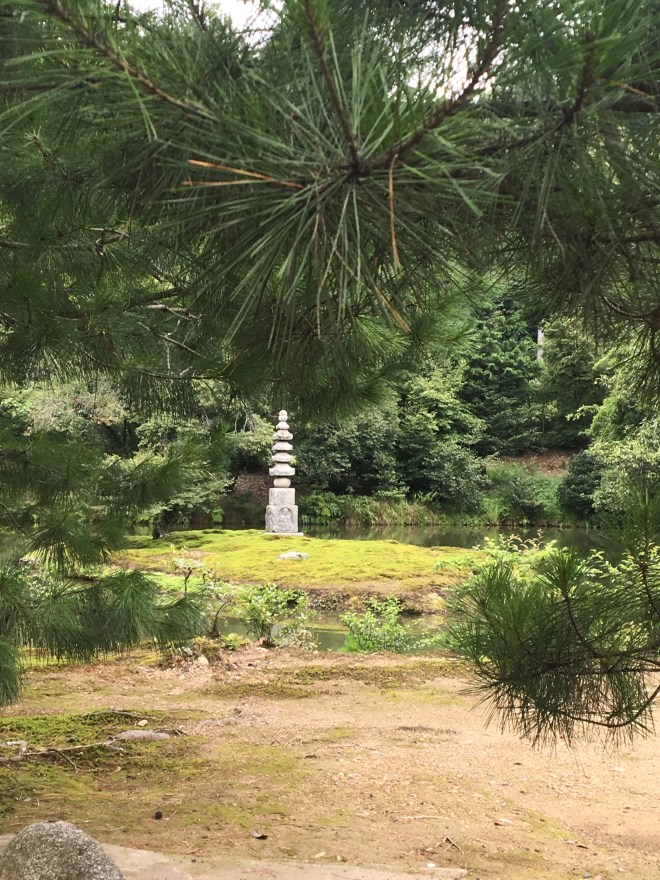 The last full day in Kyoto was inspirational, and also incredibly hot. Bell decided to chill and planned to visit some art galleries while Bert and I went on a guided cycle around the northwest of Kyoto. We met Annie, our guide, who spoke good English and was very knowledgeable. She had lived in Bournemouth for six months, and also in Hastings. Not sure what impression that would have left her with the English way of life but being born in Bournemouth, I am a big fan of it. She had also been a school teacher and lived in Kobe – so commuted an hour and a half to run cycling trips around Kyoto. I had started to sweat soon after leaving our temple home. By the time we reached the Golden Pavilion in Kinkakuji, I was regretting my choice of skort as it seemed to be acting as a double layer of clothing when one layer would be too much. The Golden Pavilion was gorgeous – if a little ostentatious – but a crazy monk who was said to dislike perfection had burned it down many years ago, and had been captured. The crazy monk’s mum was so ashamed she killed herself. Annie was full of these types of stories – some were more uplifting…